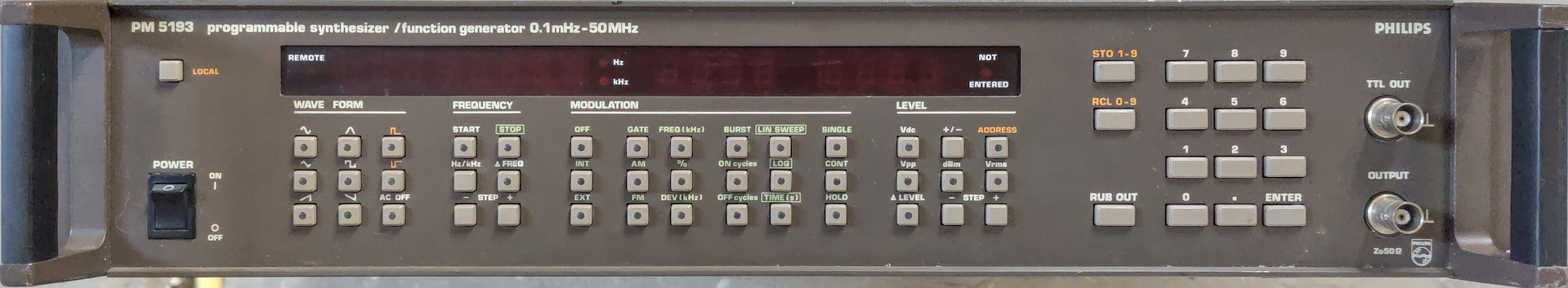 The Philips PM5193 is a programmable synthesizer / function generator capable of generating frequencies up to 50 MHz. Apart from sine, square and triangle waves the device can also generate sawtooth, pulses and the unusual haversine.